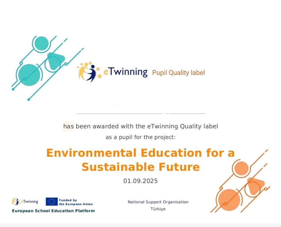 Okulumuz, “Sürdürülebilir Bir Gelecek İçin Çevre Eğitimi“ konusunda yaptığı E Twinning projesi ile Ulusal Kalite Etiketi aldı. Proje yürütücüsü öğretmenlerimiz Fatma Tokgöz’e ve Serap Sencer’e, projede görev alan öğrencilerimize Okul Müdürümüz İbrahim Yılmaz tarafından kalite etiketleri takdim edildi. Emeklerinden dolayı öğretmenlerimizi ve öğrencilerimizi tebrik ediyoruz.
